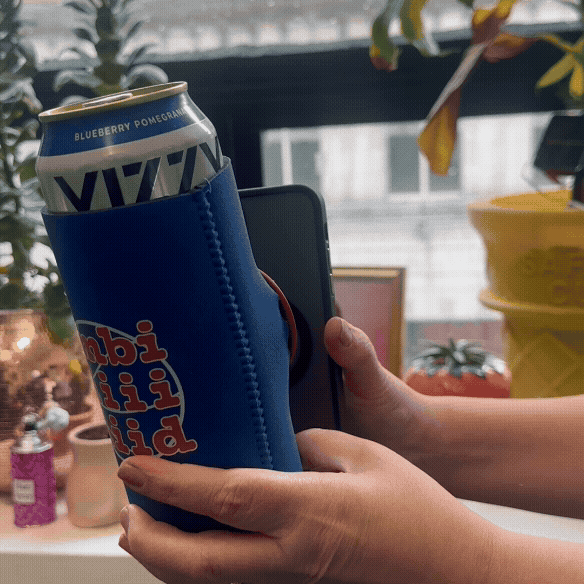 The MagHugg™ functions by placing a can inside the neoprene sleeve and positioning the ring side toward a magnet-capable phone case.
