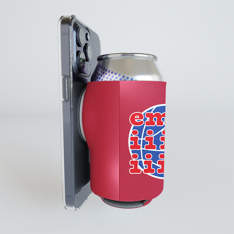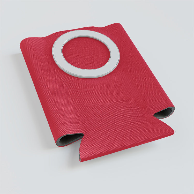 The MagHugg™ functions by placing a can inside the neoprene sleeve and positioning the ring side toward a magnet-capable phone case.