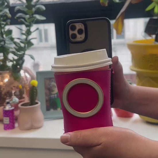 The MagHugg™ functions by placing a can inside the neoprene sleeve and positioning the ring side toward a magnet-capable phone case.