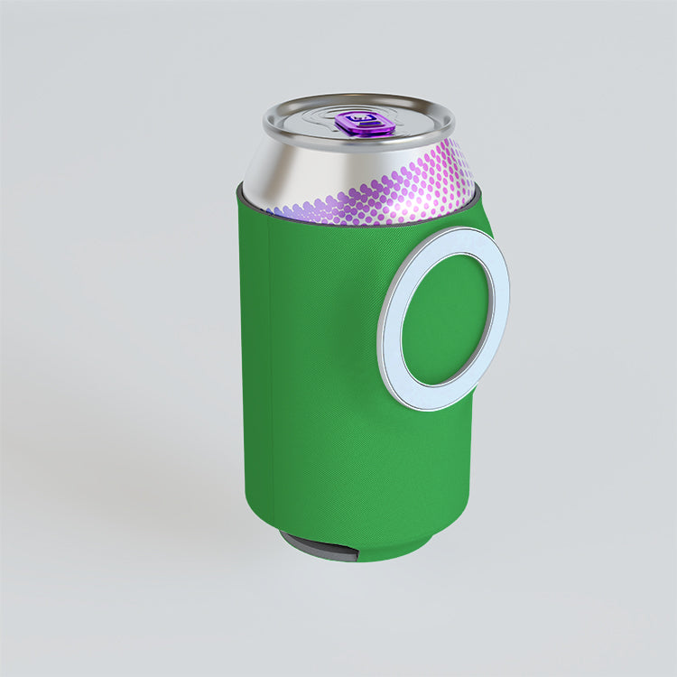 The MagHugg™ functions by placing a can inside the neoprene sleeve and positioning the ring side toward a magnet-capable phone case.