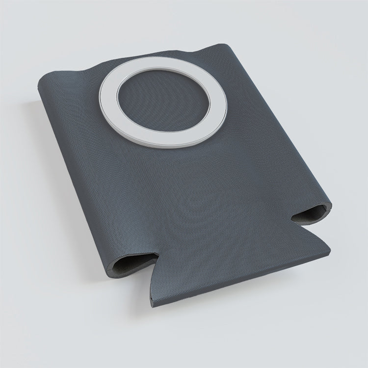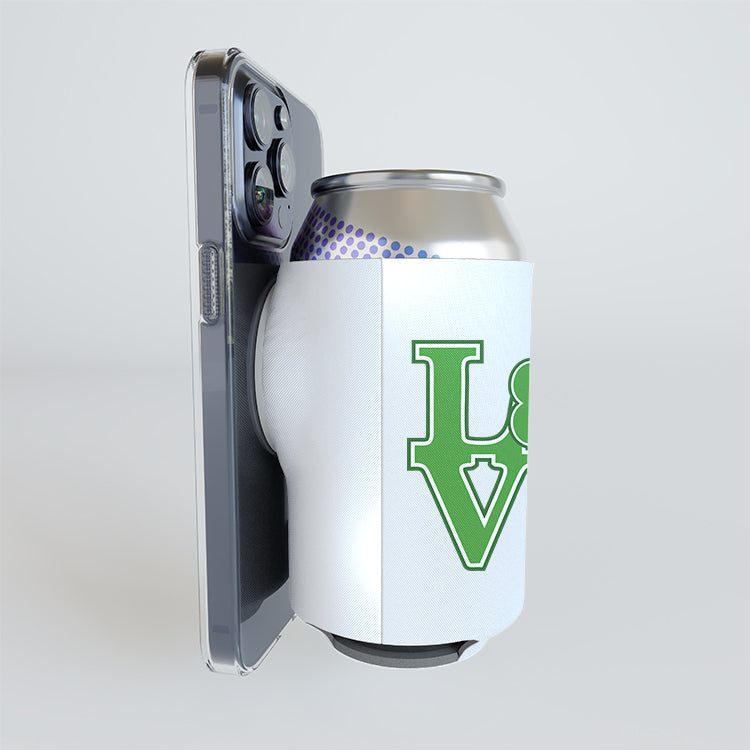 The MagHugg™ functions by placing a can inside the neoprene sleeve and positioning the ring side toward a magnet-capable phone case.