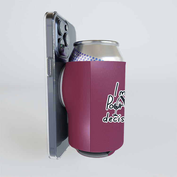The MagHugg™ functions by placing a can inside the neoprene sleeve and positioning the ring side toward a magnet-capable phone case.