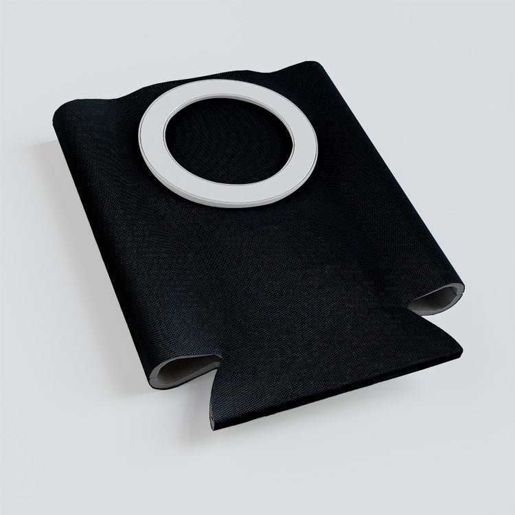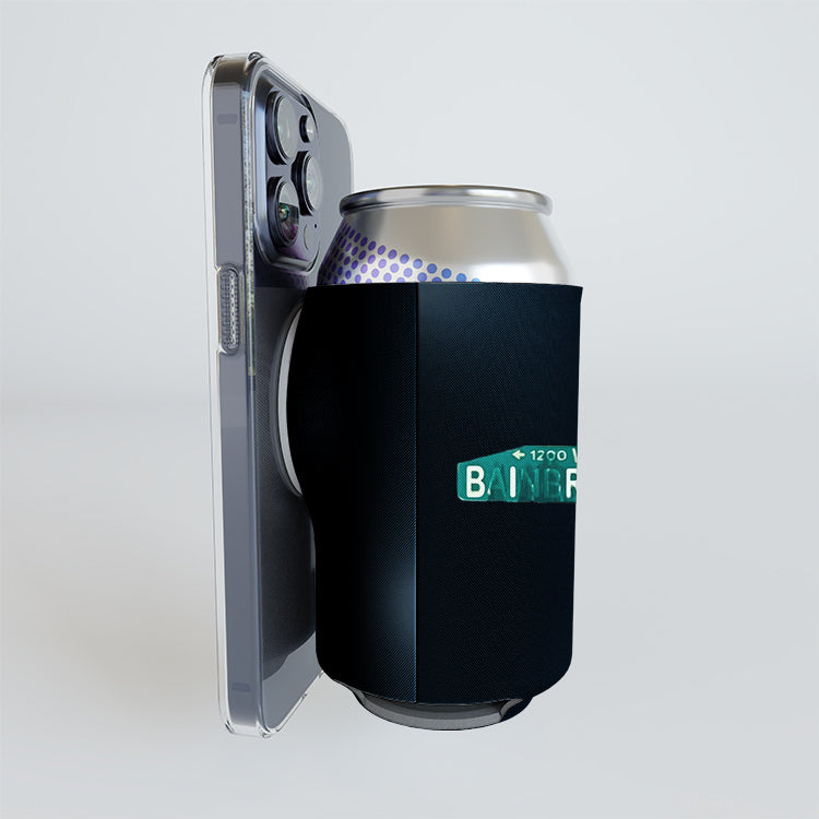 The MagHugg™ functions by placing a can inside the neoprene sleeve and positioning the ring side toward a magnet-capable phone case.